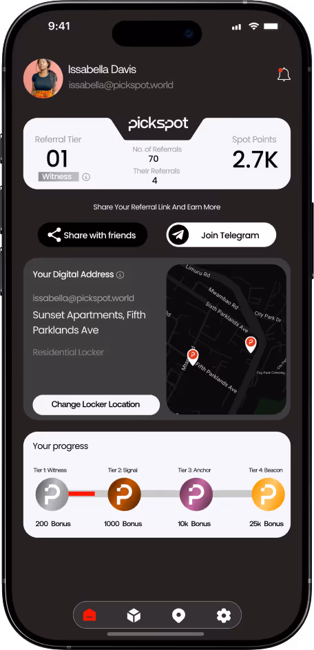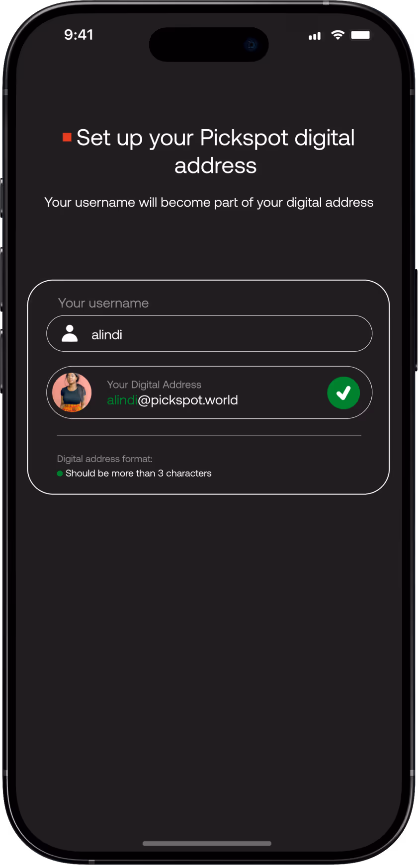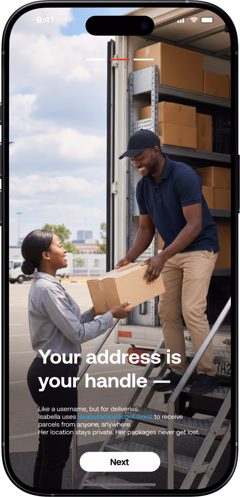 Over a billion people in emerging markets still lack a dependable address. PickSpot fixes this with digital handles linked to verified pickup points. No calls, no confusion—just a handle and a pickup point that works — anywhere. Your address lives in the PickSpot app. It’s private, portable, and always ready.
