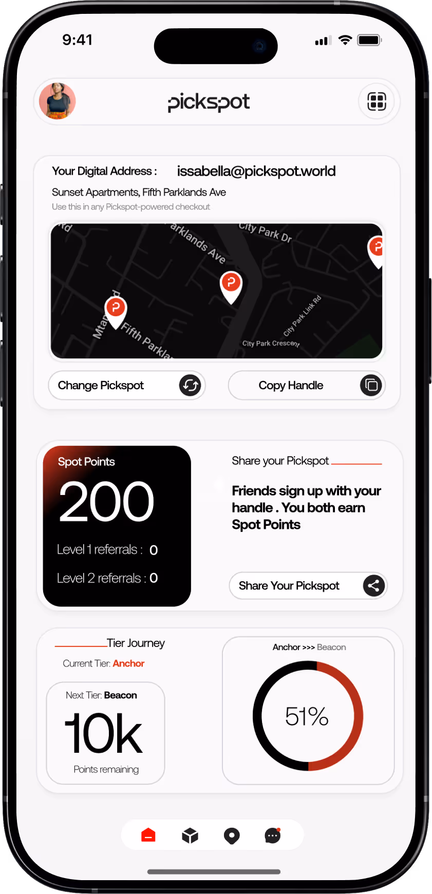 Over a billion people in emerging markets still lack a dependable address. PickSpot fixes this with digital handles linked to verified pickup points. No calls, no confusion—just a handle and a pickup point that works — anywhere. Your address lives in the PickSpot app. It’s private, portable, and always ready.