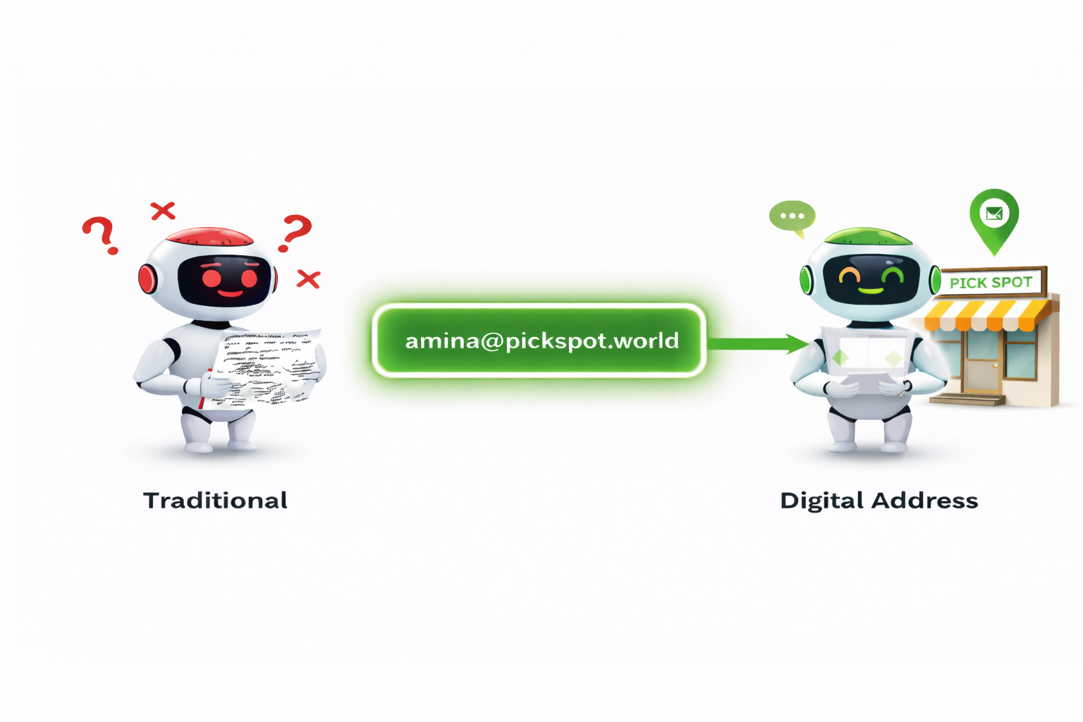 Digital addresses like amina@pickspot.world aren't just cleaner checkout forms. They're portable, machine-readable identifiers.