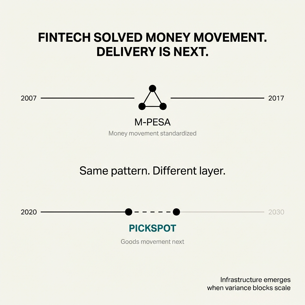 The pattern that created fintech a decade ago is repeating. Payment friction prevented transaction completion. Infrastructure emerged to standardize money movement. Delivery uncertainty now blocks transaction completion at the same scale. The bottleneck shifted from "did the money arrive" to "will the parcel arrive."